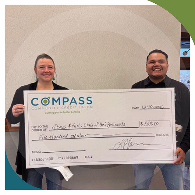 Compass held their annual Holiday Party for staff and employees were invited to participate in the annual 50/50 raffle. 50% is awarded to support a local charity, selected by the employees. This year’s recipient is the Eureka Boys & Girls Club, and Compass was honored to present this wonderful organization with a check for $500. Pictured is Monica Rose, Executive Director of the Eureka Boys & Girls Club and Mathew Arellano, Retail Team Leader for the Henderson Center Branch.