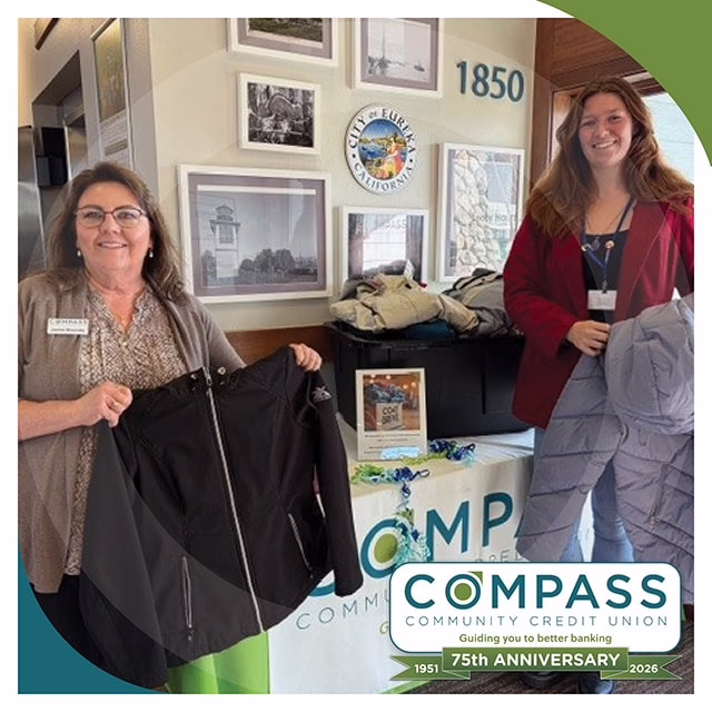 Compass members and staff answered the call by donating a large assortment of coats and jackets to the local community. Janine Sheesley, Compass Retail Team Leader, Henderson branch, presented the donated items to Siena Parrish, Community Outreach Coordinator from C.A.P.E. & Uplift Eureka Program. Items will be distributed to individuals in need – thank you for your support.