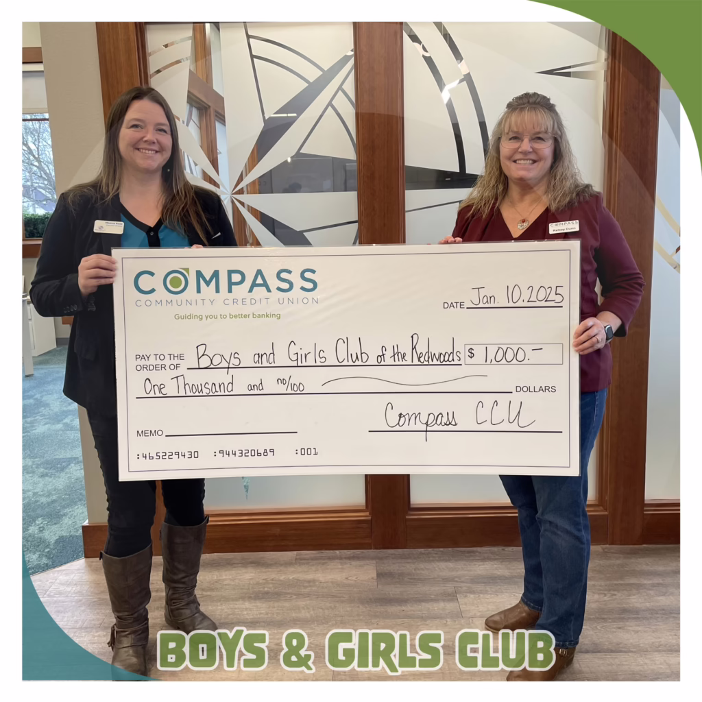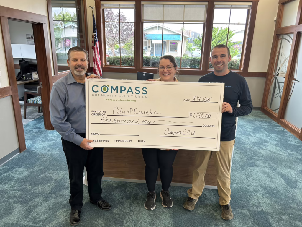We are thrilled to sponsor 11 students to participate in camp this fall, offered by Eureka Community Services. Jim and Catherine, both from Eureka Community Services, were present to accept the campership funds, presented by Bruce Lund, AVP of Marketing and Retail Banking from Compass Community Credit Union. We love supporting local kids!