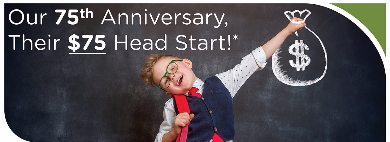 Celebrate our 75th Anniversary by opening a new savings account with e-statements, and we’ll match your deposit dollar-for-dollar, up to $75!